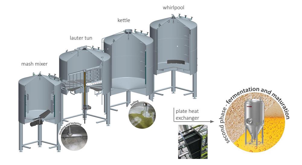 The beer production process can be divided into two phases. The first phase, brewing, is performed inside a brewhouse, where a mixture of malt, water, and hops is used to obtain wort. The second phase, fermentation and maturation, is carried out in specially designed tanks (fermenters and maturation tanks). These tanks are used to transform wort into young beer, which then goes through the maturation process in order to obtain the final product - beer.