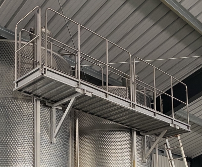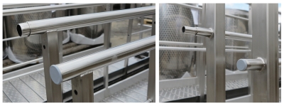 | Demontažno vpetje ograje na podest je manj stabilno. Taka ograja je manj toga na stranske obremenitve in pri naslanjanju na ograjo uporabniku ne daje občutka sigurnosti. | Ograjni sistem Škrlj je mnogo bolj tog. Stebrički ograje so varjeni na stranico podesta. Spoji med stebričkom ograje in prečnimi cevmi so prav tako varjeni. Nihanje ograje pri stranskih obremenitvah je minimalno, kar daje uporabniku občutek varnosti in sigurnosti pri uporabi podesta. |